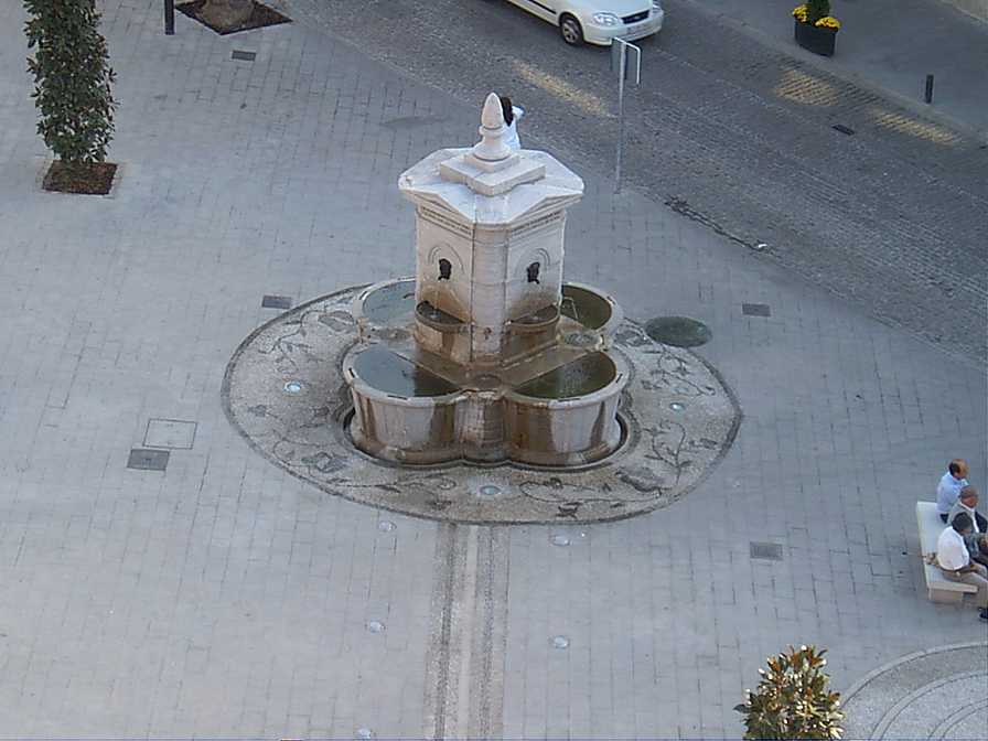 Vista desde la torre de la iglesia. En la parte derecha del nuevo empedrado se puede ver el círculo, que aunque aquí parece una alcantarilla, es el cristal que cubre el pozo encontrado durante esta reforma