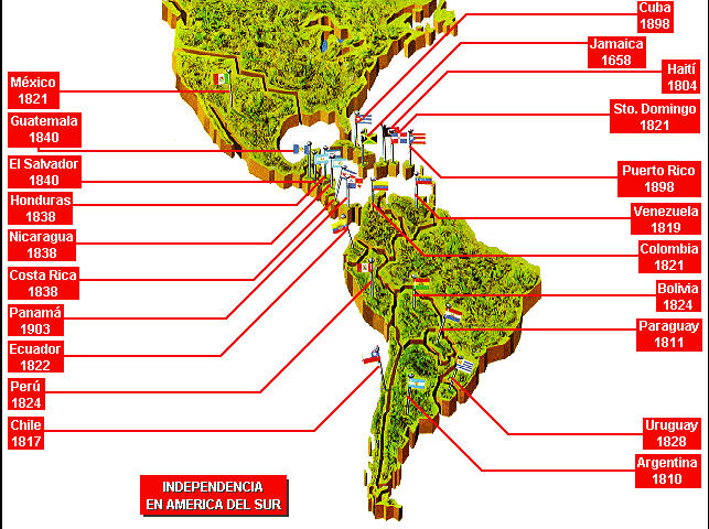 XVIII con las reformas tendentes a racionalizar la administración, e incluso se había extendido hacia nuevas zonas de colonización (con la creación de los virreinatos del Río de la Plata y Nueva Granada). Pero, al mismo tiempo, los españoles habían tenido que suavizar el monopolio comercial, abriendo América al libre comercio con otros puertos de la península y, parcialmente, con otros países europeos (por una sucesión de medidas dictadas entre 1713 y 1797); esto no era sino reconocer la realidad de que el contrabando había crecido hasta proporciones desmesuradas y que la metrópoli no tenía los medios para seguir exigiendo un monopolio estricto. El desarrollo económico y cultural de las ciudades americanas había dado lugar al surgimiento de una burguesía criolla, descendiente de españoles, pero celosa de sus intereses y dispuesta a emprender el camino de la independencia que le mostraban los Estados Unidos de Norteamérica (emancipados de Gran Bretaña en 1776).La invasión francesa de España fue el detonante para que estallaran rebeliones independentistas por toda Hispanoamérica, aprovechando el vacío de poder en la metrópoli. La lucha por la independencia se desarrolló por separado en cada colonia, a partir de la insurrección de