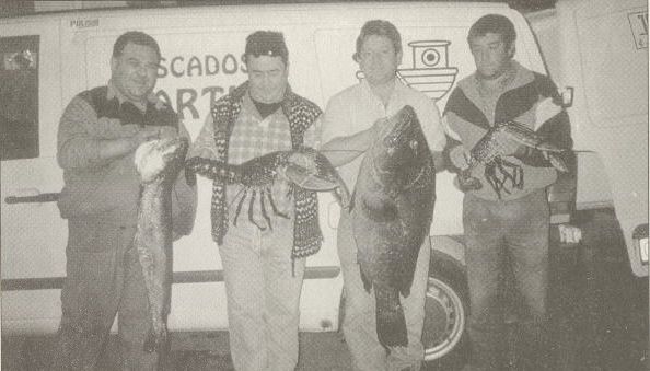 LOS "BICHOS" DE ALBERTO .Alberto es un durqueño que pesca en los mejores mercados de España. En este caso lo vemos con algunos de los ejemplares con los que habitualmente suministra las pescaderías granadinas: una merluza de diez kilos, dos bogavantes de seis y cinco, y un mero de veinte. Desconocemos en este caso cual fue el destino final de los `bichos" que nos muestran Alberto y sus amigos.