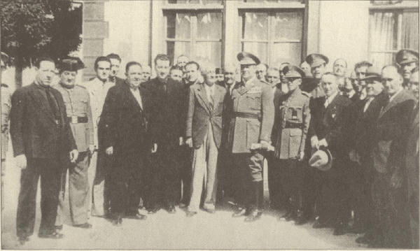 | EL COMANDANTE LÁZARO EN EL PALACIO DE DÚRCAL. La foto que traemos este mes a nuestra portada fue hecha hace 57 años. En ella podemos ver al Comandante Lázaro (en el centro de la foto, el militar más alto y corpulento) en el Palacio de los Echevarría (hoy ya desaparecido), a donde vino invitado por don Celestino (a su derecha), momento que recoge la foto. El comandante no era de Dúrcal, y tenía plaza en Melilla, pero visitaba mucho Dúrcal, el pueblo de Ana Isabel Conejero Ibáñez, que era la niñera de sus hijos. En este acto del Palacio le fue entregado un pergamino. En la foto, podemos ver también al entonces alcalde, José Puerta Molina (con traje y corbata oscuros y bigote). El comandante quedó unido para siempre con Dúrcal, donde tiene dedicada una calle. Foto cedida por gentileza de CRISTALERÍA ARIAS |