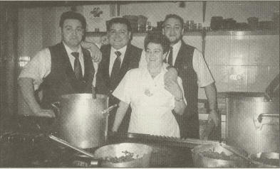 Mamá Lourdes, entre fogones, rodeada por sus tres hijos: Juan Miguel, Antonio y Carlos.