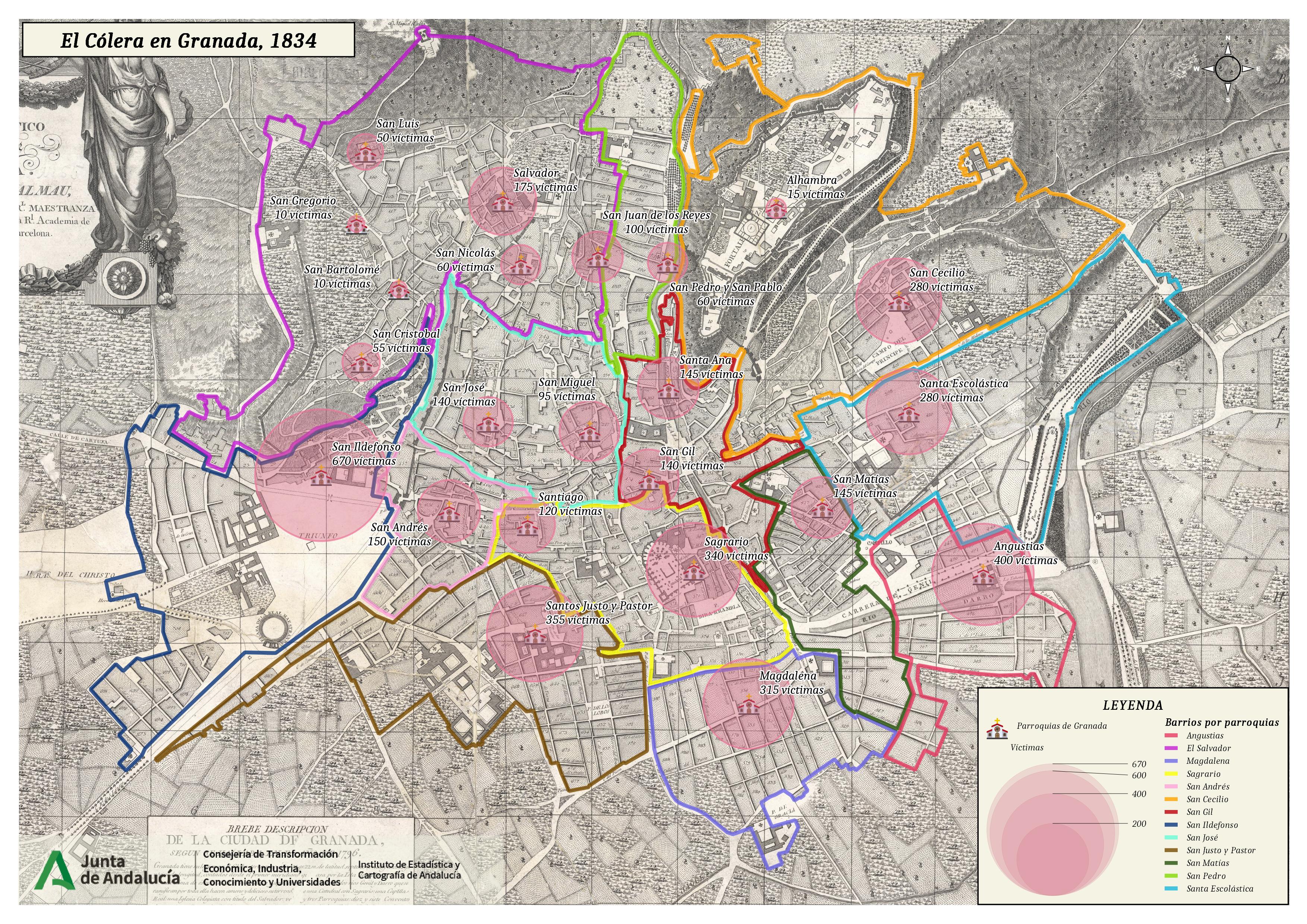 Si nos ponemos en antecedentes, un reciente estudio sobre las epidemias de la ciudad de Granada a mediados del siglo XVII determina que en esos años se produjo en realidad una epidemia de tifus exantemático y no la peste bubónica como hasta ahora se pensaba4. Si bien es cierto que podría haberse confundido una enfermedad por otra, en esos años las más mortíferas fueron la peste, el tifus y en menor medida la gripe, el cólera, o la malaria5. A su vez, un posible brote de disentería en 1635 en Granada pone de manifiesto el problema de las aguas contaminadas de la acequia de Axaris o de San Juan, la cual se transmitiría posteriormente por la falta de higiene personal o en la manipulación de los alimentos, teniendo síntomas similares a la peste o el cólera6. Esto nos invita a pensar que los estudios cada vez son más exhaustivos y, aunque no cambien los resultados que se produjeron en la población, si lo hacen sus motivos.