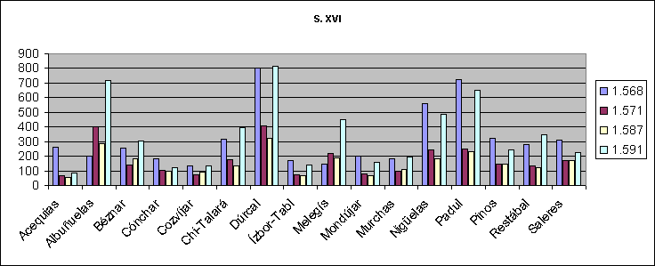 | S.XVI | Acequias | Albuńuelas | Béznar | Cónchar | Cozvíjar | Chi-Talará | Dúrcal | Ízbor-Tabl | Melegís | Mondújar | Murchas | Nigüelas | Padul | Pinos | Restábal | Saleres | Total | ||