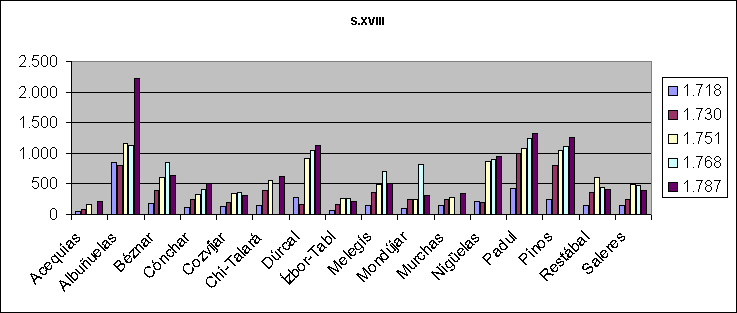 | S.XVIII | Acequias | Albuńuelas | Béznar | Cónchar | Cozvíjar | Chi-Talará | Dúrcal | Ízbor-Tabl | Melegís | Mondújar | Murchas | Nigüelas | Padul | Pinos | Restábal | Saleres | Total | ||