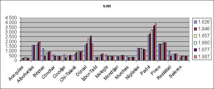 | S.XIX | Acequias | Albuńuelas | Béznar | Cónchar | Cozvíjar | Chi-Talará | Dúrcal | Ízbor-Tabl | Melegís | Mondújar | Murchas | Nigüelas | Padul | Pinos | Restábal | Saleres | Total | ||