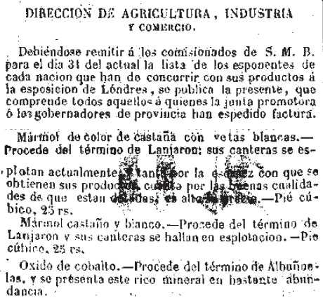 1851-2-1 España. Productos que se listan en la exposición de Londres. Mármol de