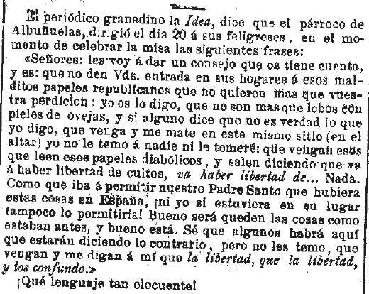 1869-1-3 Imparcial. El párroco de Albuñuelas exhorta contra la República
