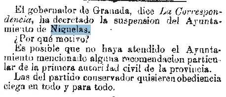 1880-12-28 Iberia. Se suspende el ayuntamiento de Nigüelas