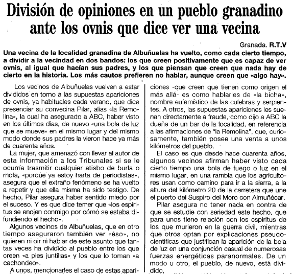 - 23/08/1994. Una vecina de Albuñuelas dice que ha visto una bola de luz