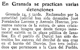 - 15/12/1933. Detenidos los autores del derribo de la cruz del Darrón