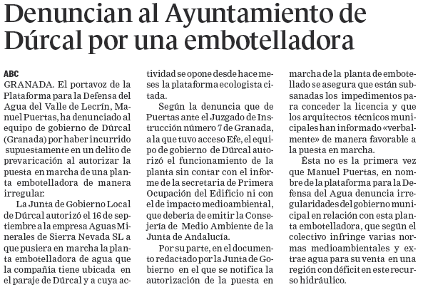 - 22/09/2008. Denuncian al ayuntamiento de Dúrcal por una embotelladora