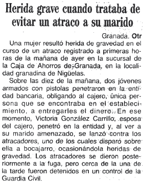 - 15/02/1985. Herida grave cuando trataba de evitar un atraco a su marido