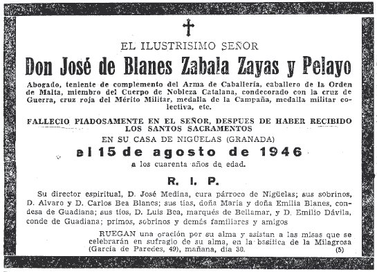 - 29/08/1946. Muere Don José Blanes Zabala Zayas y Pelayo