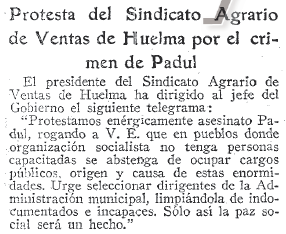 - 06/02/1932. Protesta del Sindicato Agrario de Ventas de Huelma por los