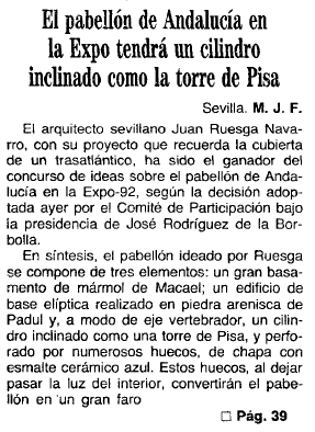 - 21/11/1989. El Pabellón de Andalucía se realizará con piedra arenisca
