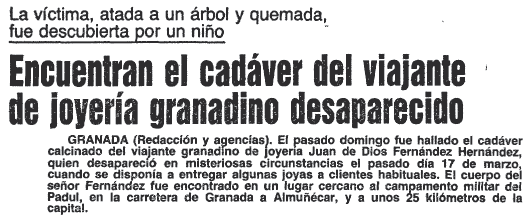 - 14/04/1981. Se encuentra el cadáver de un viajante de joyería en el