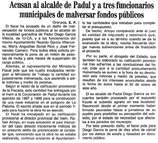 - 04/02/1993. Acusan al alcalde y a tres funcionarios de malversar fondos
