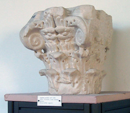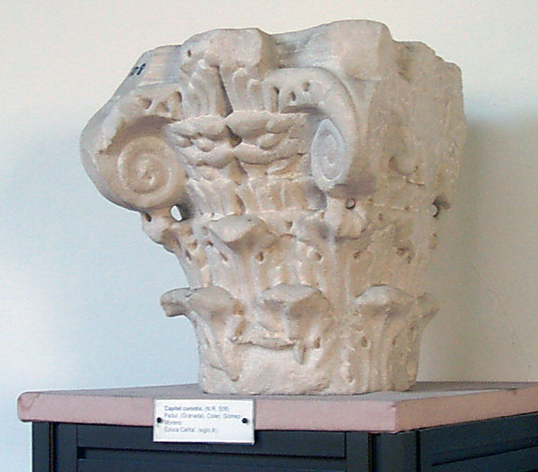 Capitel de orden compuesto. ; Capitel tallado de acuerdo al orden compuesto, solución muy escasa en el período emiral, quizá por seguimiento a la tradición clásica en la Península que ha dejado un número mucho menor (Mª. A. Gutiérrez Behemerid, 1984: 81). ; Presenta cálatos troncocónico con dos filas de ocho hojas de acanto que aparecen despegadas en la parte superior iniciando una caída. La talla de cada hoja, presenta una solución naturalista. El astrágalo aparece corregido alrededor del núcleo del capitel y decorado con una fila de hojillas puntiagudas. El equino presenta decoración vegetal de hojas en racimo que nacen tras las volutas hacia el centro, decoración que cuenta con variantes, solución similar en el ejemplar conservado en el Museo Victoria y Alberto de Londres, núm. 10-1992, así como en otro conservado en el Museo de Santa Cruz de Toledo, núm. 5228, por ejemplo, aunque en ningún caso muestra una talla tan marcadamente naturalista y voluminosa. ; El ábaco tiene los brazos cortados, aunque deja ver su planta de cruz de brazos curvos, con dos pisos en alzado escalonados. Del inferior nacen las volutan con decoración vegetal en su origen, como se hará tradicional, y teniendo un tallo enrollado y una pequeña floración como remate. El piso superior aparece moldurado y presenta del centro de cada lado el taco tallado con decoración vegetal. ; Tiene ficha de catálogo sistemático antigua redactada por Joaquina Eguaras el 24 de febrero de 1949.