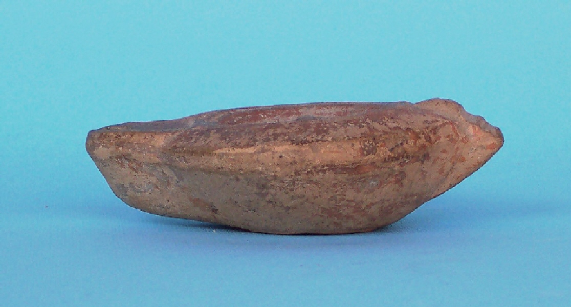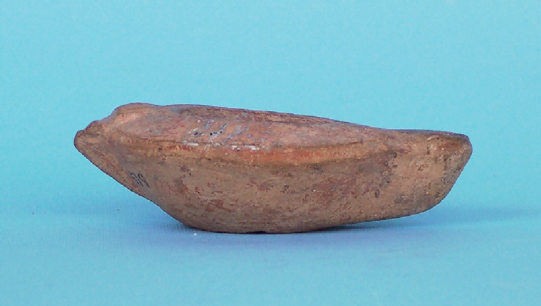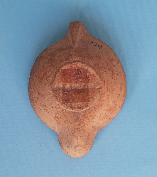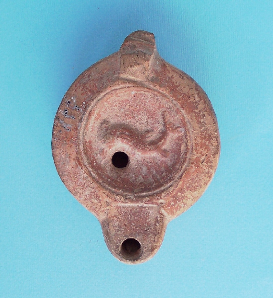 Lucerna de disco. En el disco tiene el agujero de alimentación. El disco está decorado con un relieve que representa un delfín. Buen estado de conservación. Barro amarillento. ; Tiene marca de alfarero muy borrosa en la base del depósito.