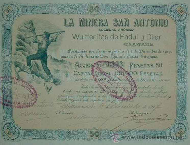 Acción de 50 pesetas de La Minera San Antonio - Wulffenitas de Padul y Dílar.