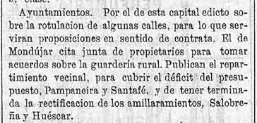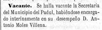 20 de agosto de 1881. Vacante secretaría de Lanjarón