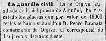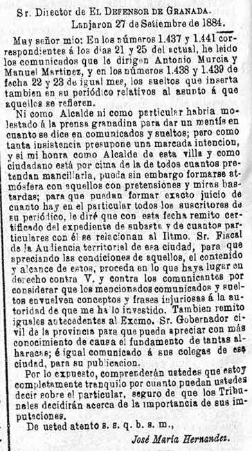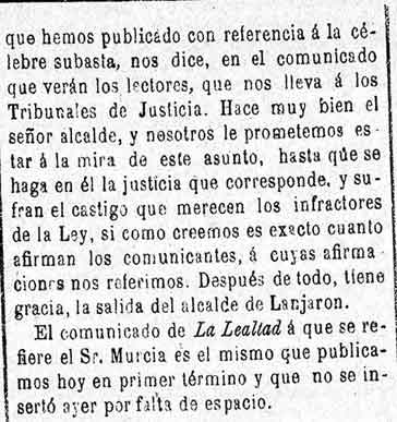 2 de octubre de 1884. Problemas con una subasta en Lanjarón
