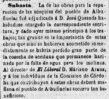 20 de febrero de 1885. Subastado el arreglo de las acequias
