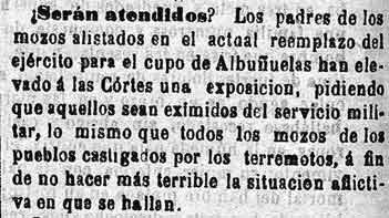 26 de febrero de 1885. Los mozos de Albuńuelas piden librarse