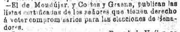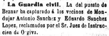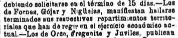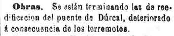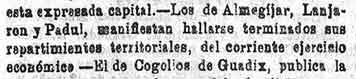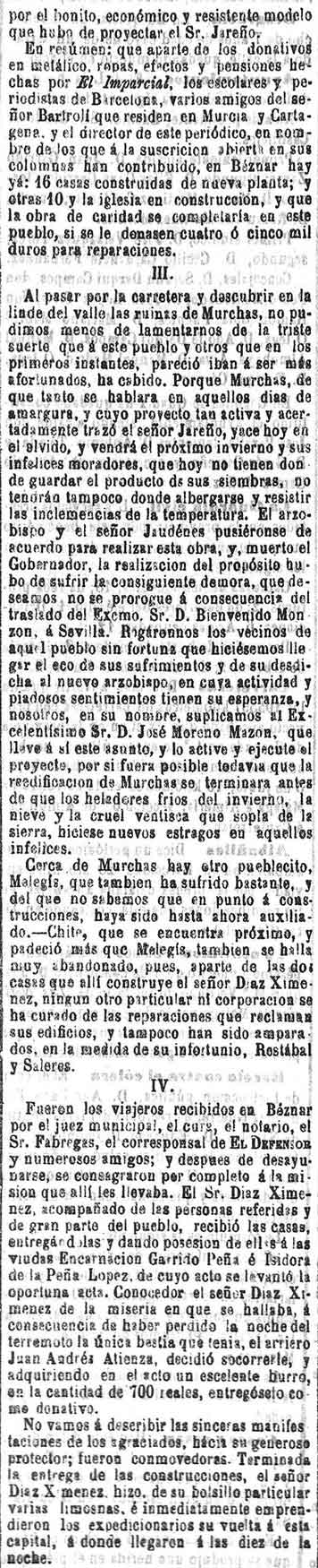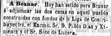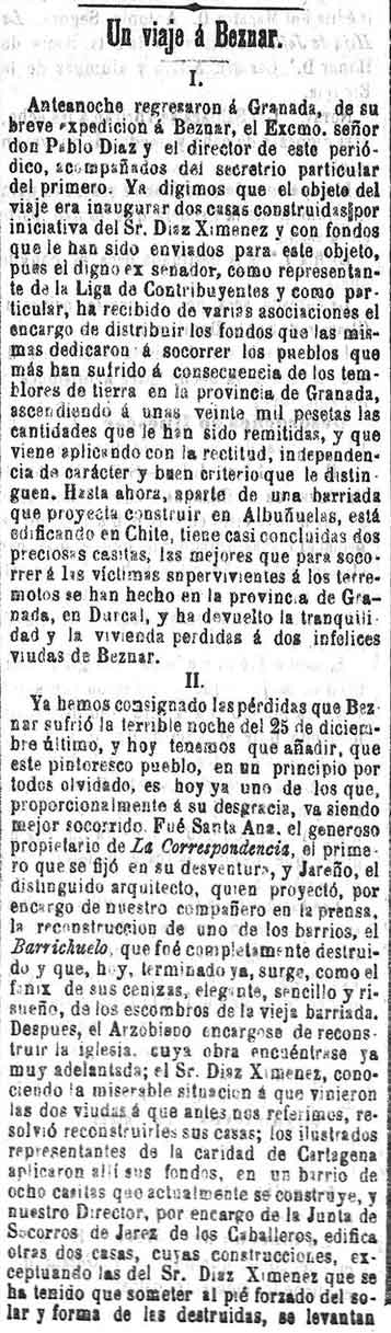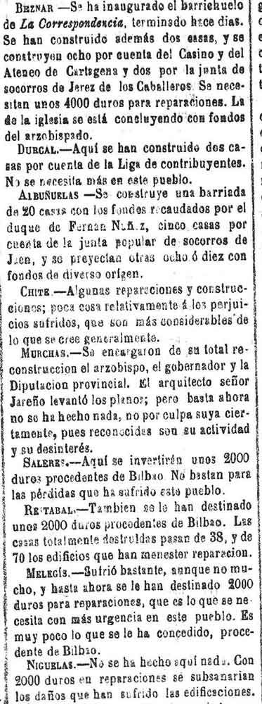 Béznar: El Barriochuelo lo ha terminado la Correspondencia. Se han construido dos casas más y el Casino del ateneo de Cartagena está haciendo 8 más, y dos más por parte de la Junta de socorros de Jerez de los caballeros. Se necesitan 4000 duros para socorros. La iglesia la repara el obispo