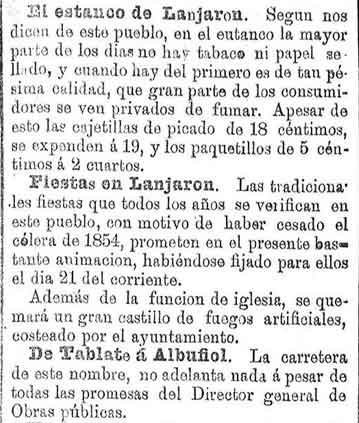 11 de noviembre de 1886. Falta tabaco en Lanjarón. Fiestas en