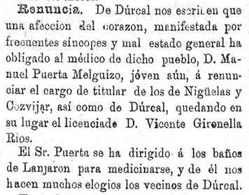 19 de noviembre de 1886. Renuncia el médico de Dúrcal D.