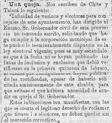 13 de abril de 1887. Quejas de los vecinos de Talará por las