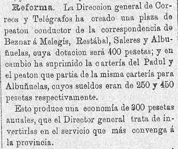 de la correspondencia de Béznar a Melegís, Saleres, Restábal y Albuñuelas. Se ha