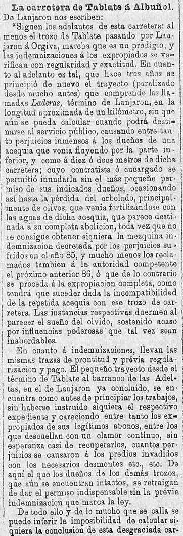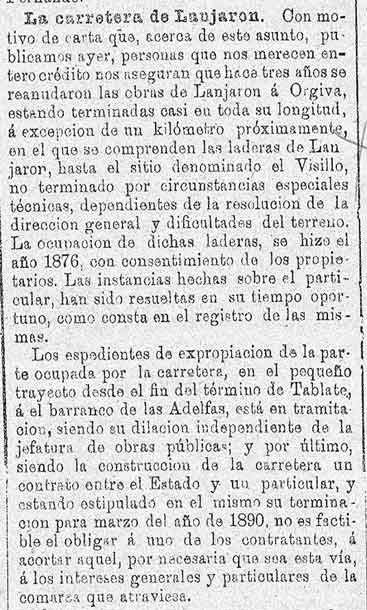 13 de mayo de 1887. Críticas al estado de la carretera de la