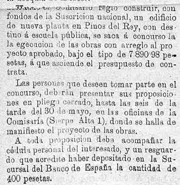 14 de mayo de 1887. Proyecto de escuelas en Pinos del Rey