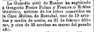 4 de marzo de 1888. Detención en Béznar a un ladrón que robó
