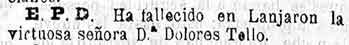5 de octubre de 1890. Doña Dolores Tello muere en Lanjarón