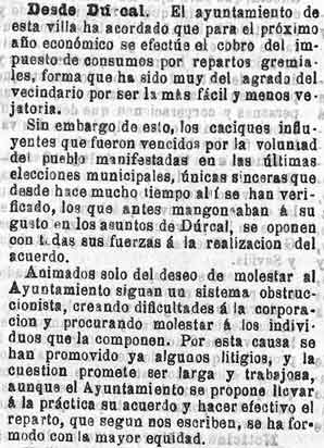 5 de enero de 1892. Problemas del ayuntamiento de Dúrcal con
