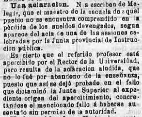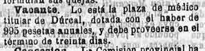 4 de febrero de 1892. Vacante la plaza de médico de Dúrcal