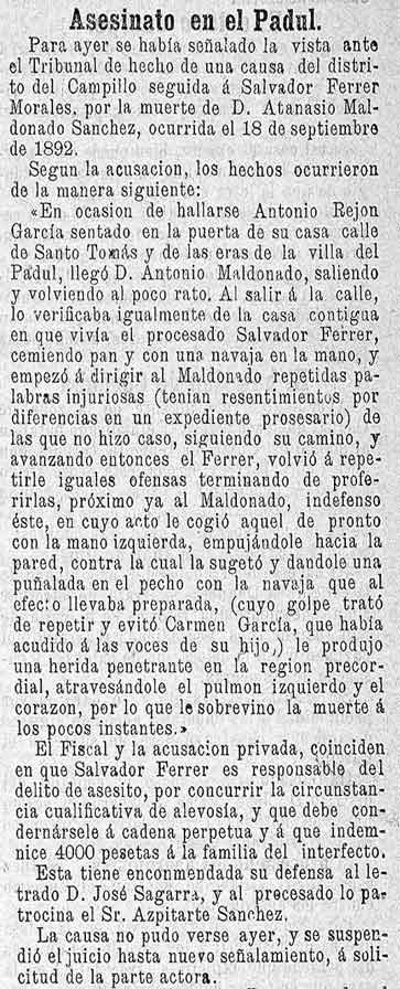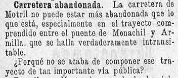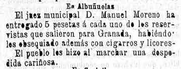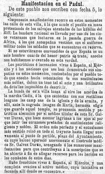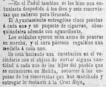 Nota: Durante esos años, los choques entre las tropas españolas estacionadas en Melilla y las tribus rifeñas limítrofes habían ido incrementándose, hasta culminar en el ataque a la ciudad durante los días 27 y 28 de octubre de 1893. Esto causa una pequeña guerra que influye en parte de las noticias de nuestra zona