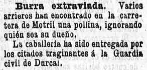 6 de junio de 1899. Burra extraviada en la carretera ha sido