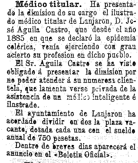 18 de enero de 1900 Médico de Lanjarón Don José Águila Castro