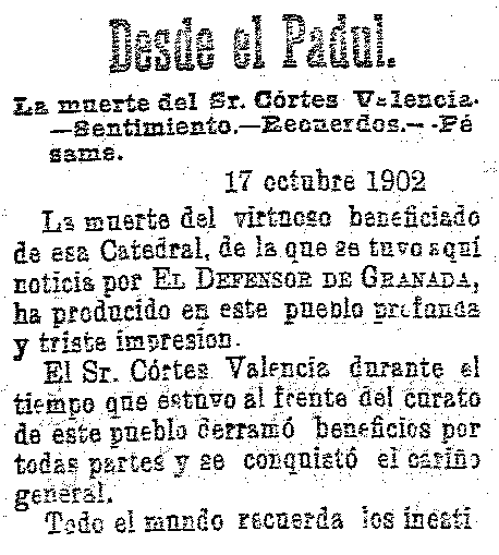 18 de octubre de 1902. Muere el cura del Padul El Sr. Cortes