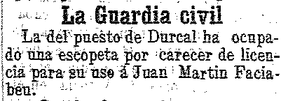 1 de diciembre de 1903. Ocupada una escopeta en Dúrcal