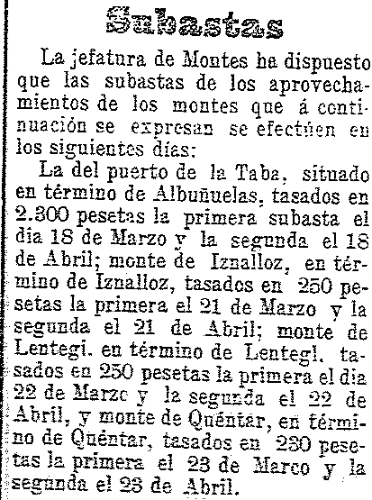 19 de febrero de 1904. Subasta de aprovechamiento de montes