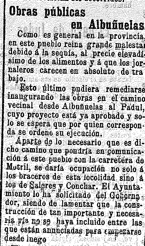 1 de abril de 1905. Ante el paro reinante en las Albuñuelas