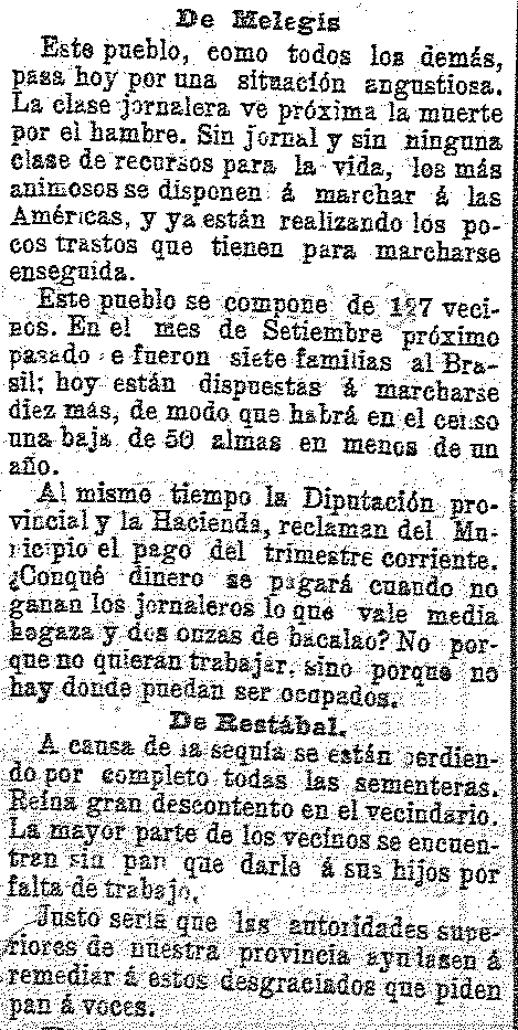 26 de marzo de 1905. Melegís y Restábal con problemas de paro a causa de la