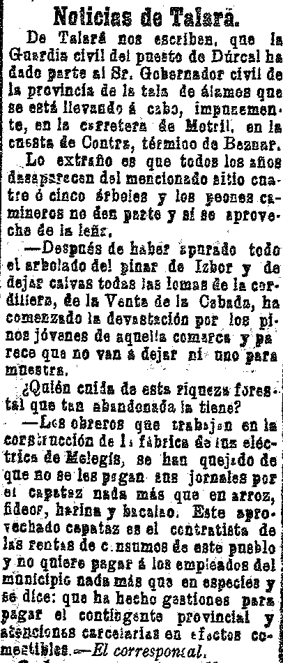 20 de septiembre de 1907. Denuncian corte de álamos en Talará