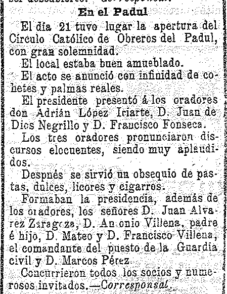 24 de junio de 1908. Se abre el círculo católico del Padul