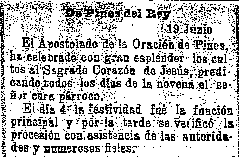 21 de junio de 1909. Cultos al Sagrado Corazón en Pinos de